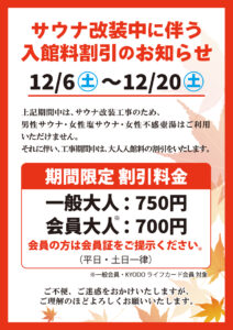12/6(土)~12/20(土)まで、サウナ改装工事のため、男性サウナ・女性塩サウナ・女性不感壺湯はご利用いただけません。