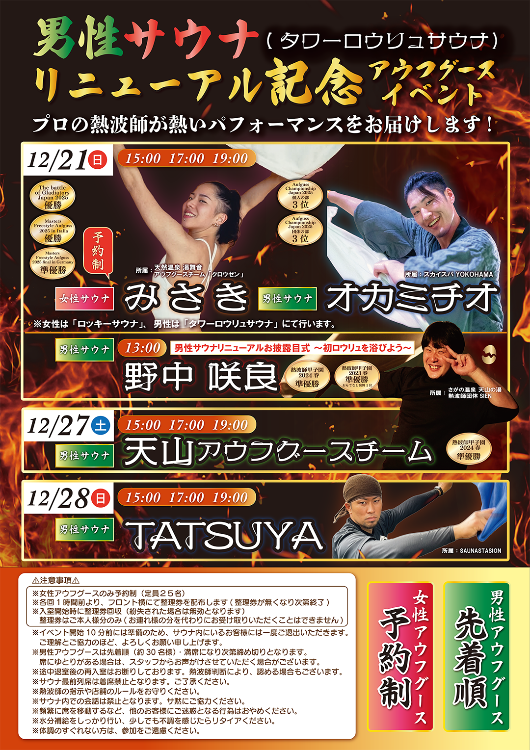 ♨️開催場所:男性タワーロウリュサウナ・女性ロッキーサウナ