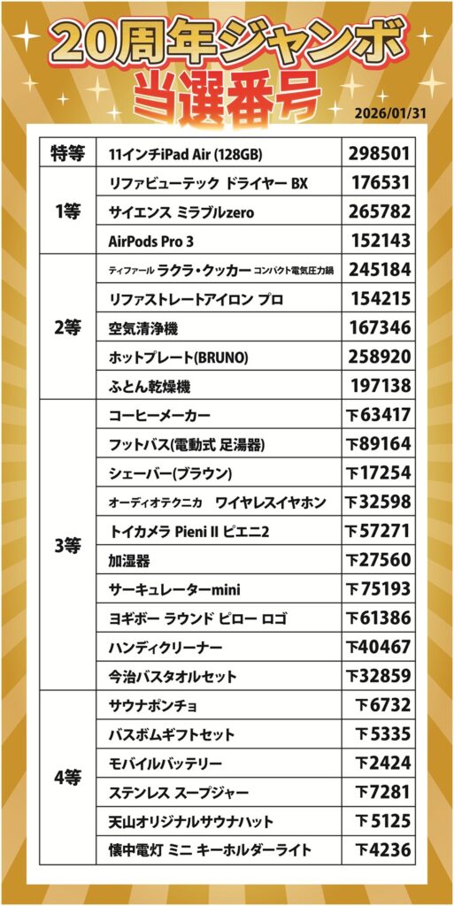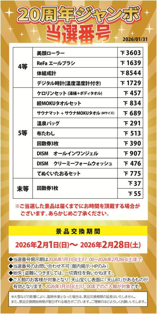 2025年12月19日(金)に配布されました、各新聞に折り込みされている『天山20周年ジャンボチラシ』をお持ちのお客様で、2026年1月31日(土)17:00までにご入館いただき、チラシ表面に『天山印』を押印されたもののみ、抽選の対象となります。