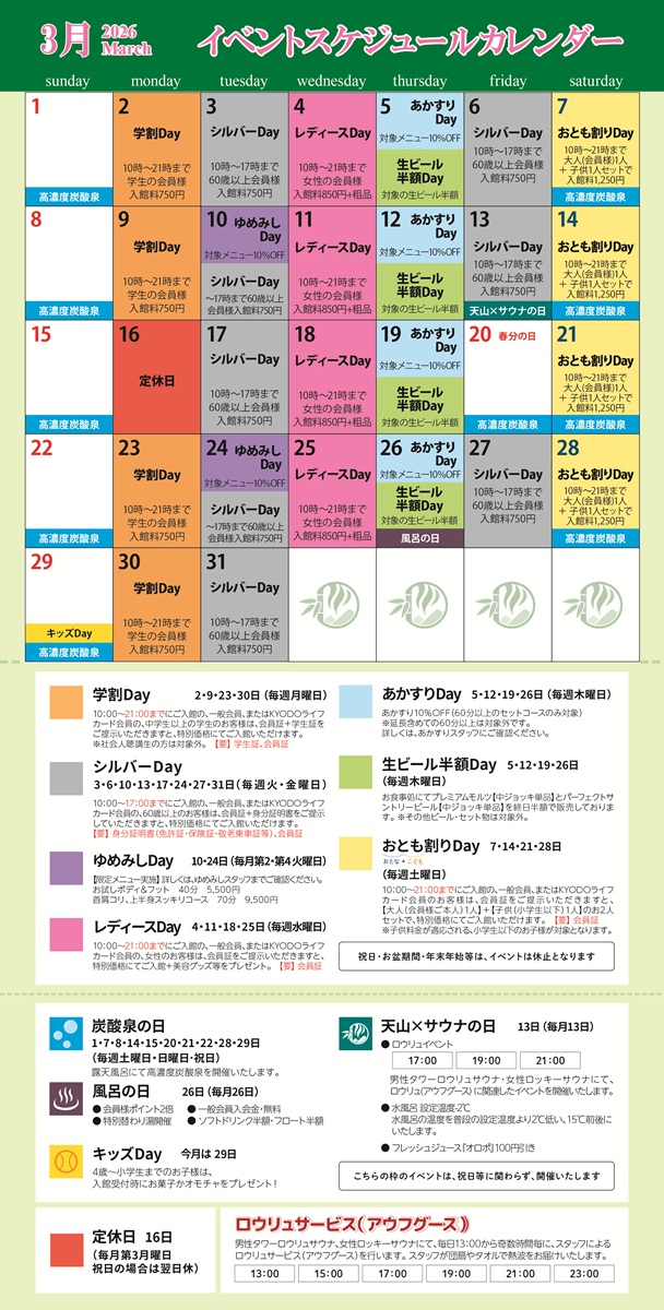 2026年3月 イベントカレンダー&ロウリュ曜日別アロマ