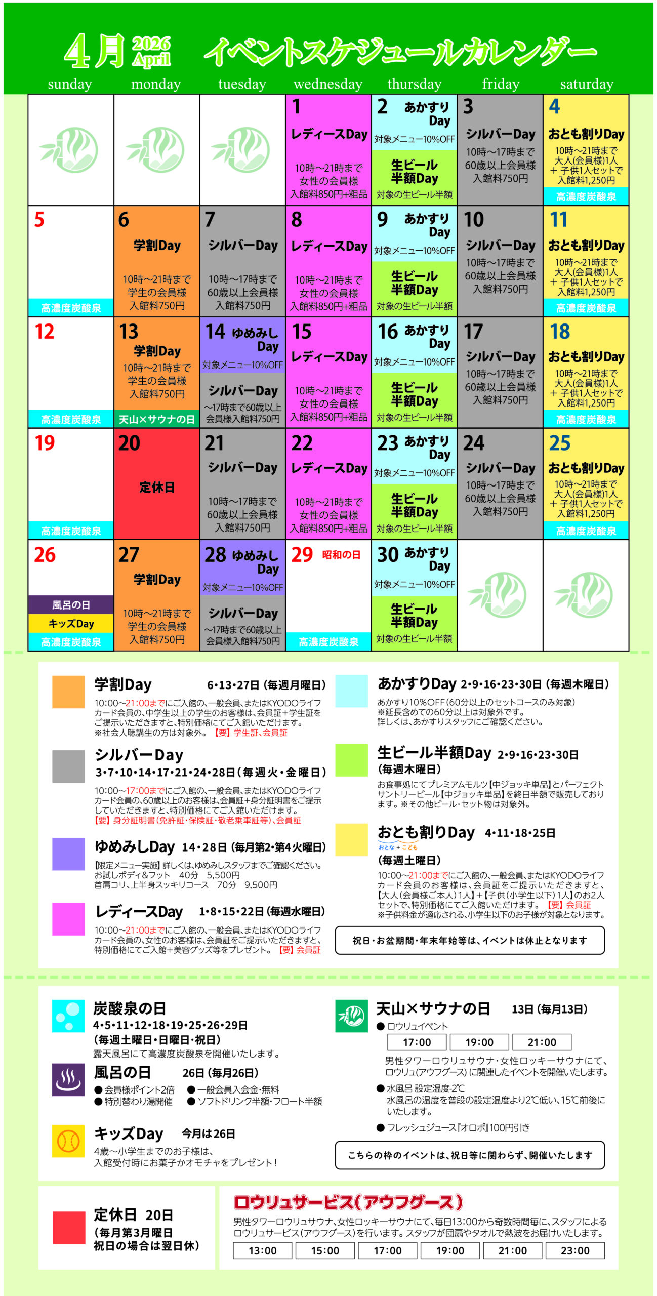 2026年4月のイベントカレンダーは下記の通りとなります。